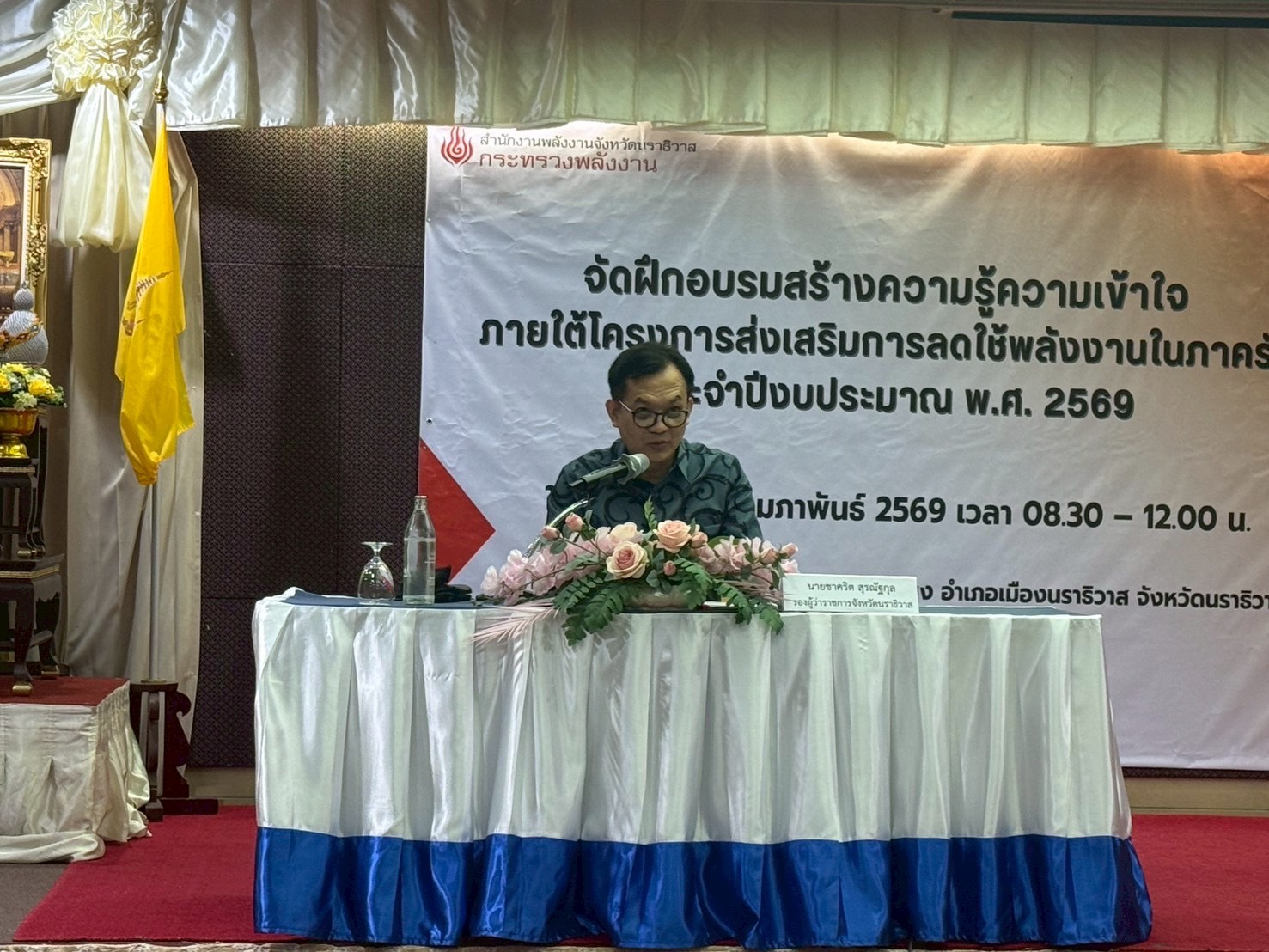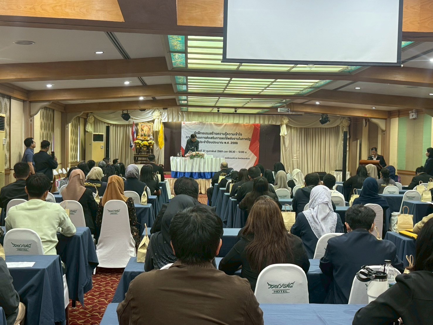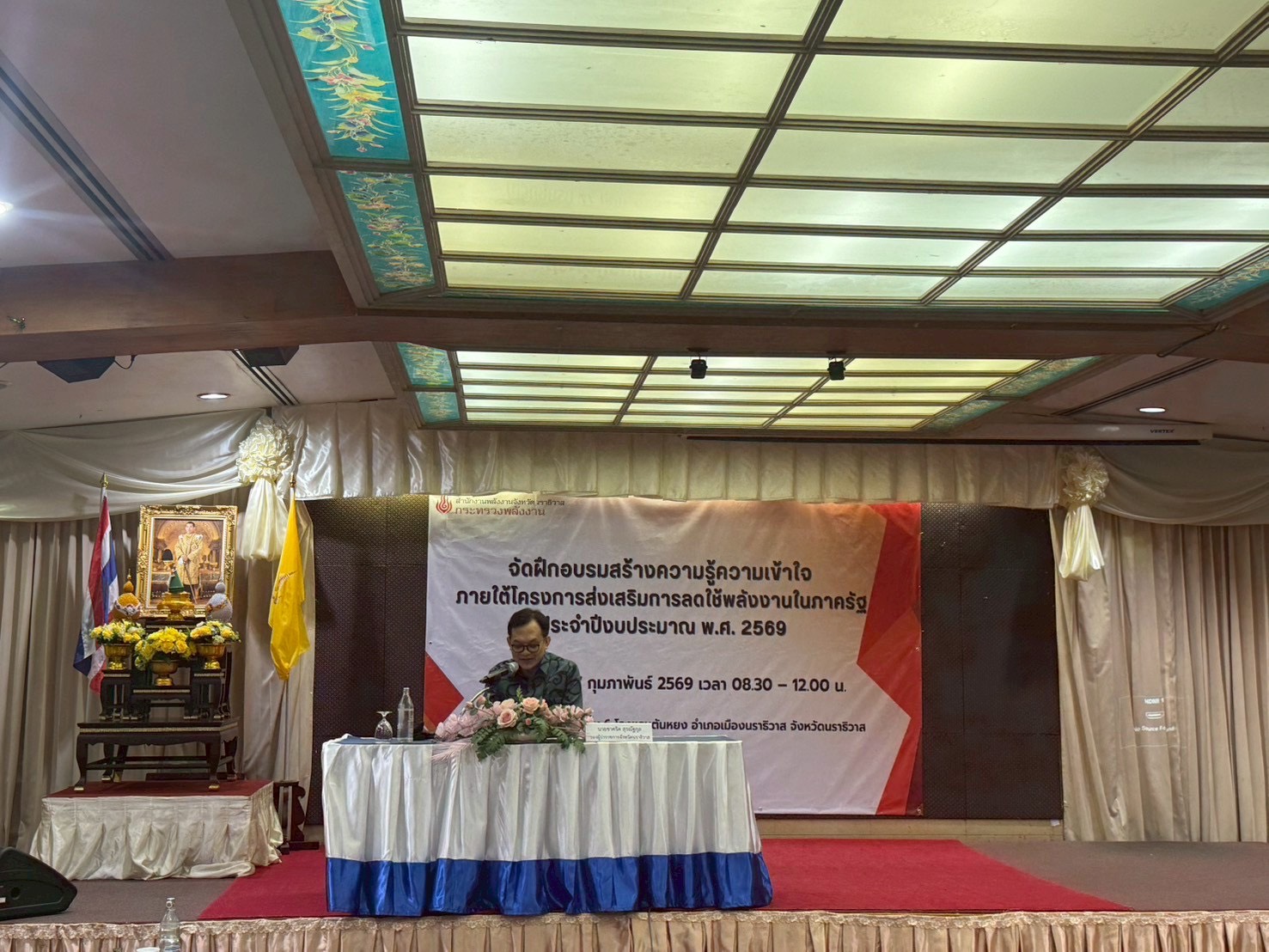 วันที่ 27 กุมภาพันธ์ 2569 เวลา 08.30 น. นายวิเชียร ทองด้วง อุตสาหกรรมจังหวัดนราธิวาส เข้าร่วมฝึกอบรมสร้างความรู้ความเข้าใจ โครงการส่งเสริมการลดใช้พลังงานในภาครัฐ ประจำปีงบประมาณ พ.ศ. 2569 ณ ห้องประชุมโสภาพิศัย ชั้น 6 โรงแรมตันหยง อำเภอเมือง จังหวัดนราธิวาส โดยมีนายชาคริต สุรณัฐกุล รองผู้ว่าราชการจังหวัดนราธิวาส เป็นประธานการประชุม