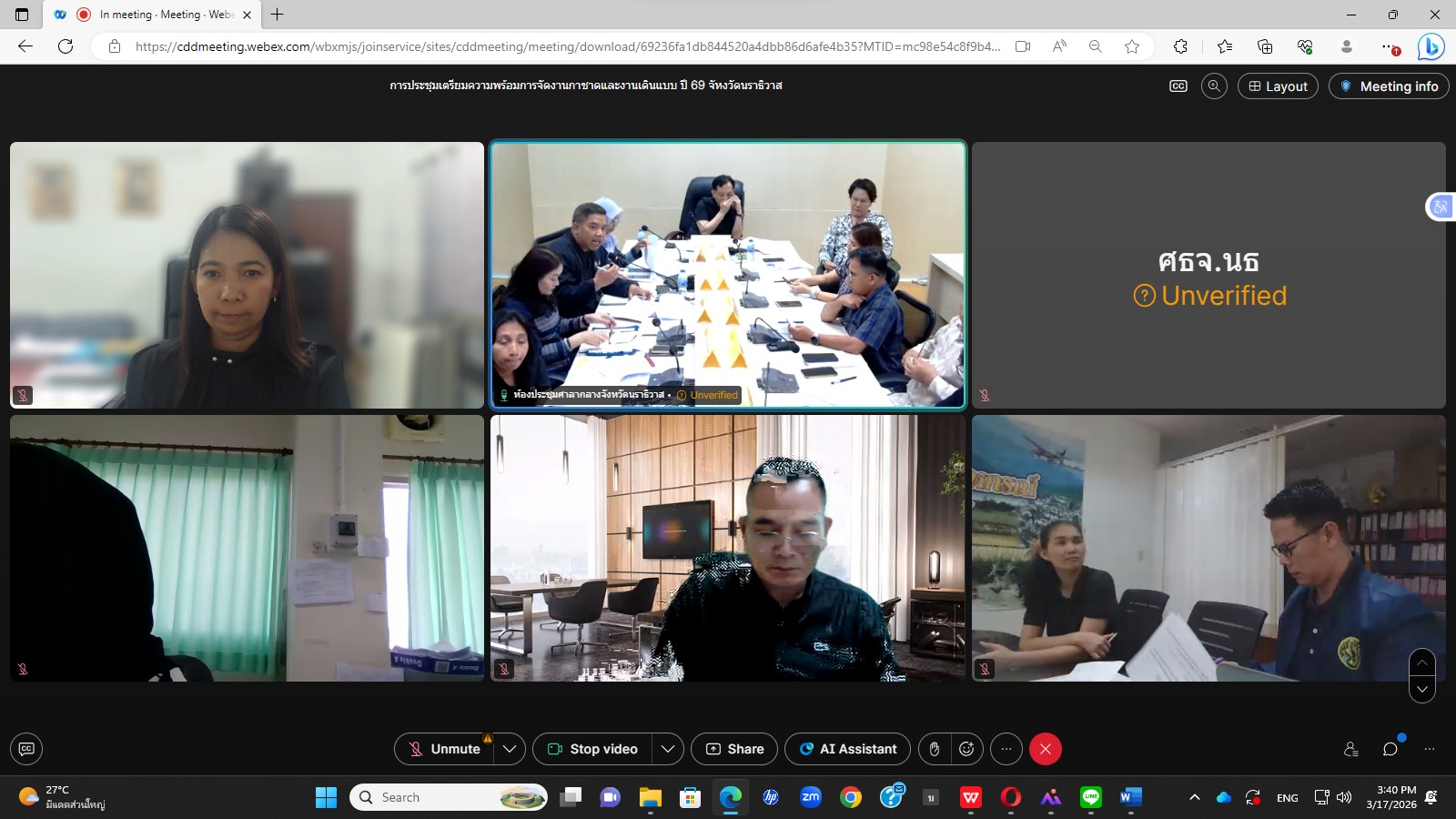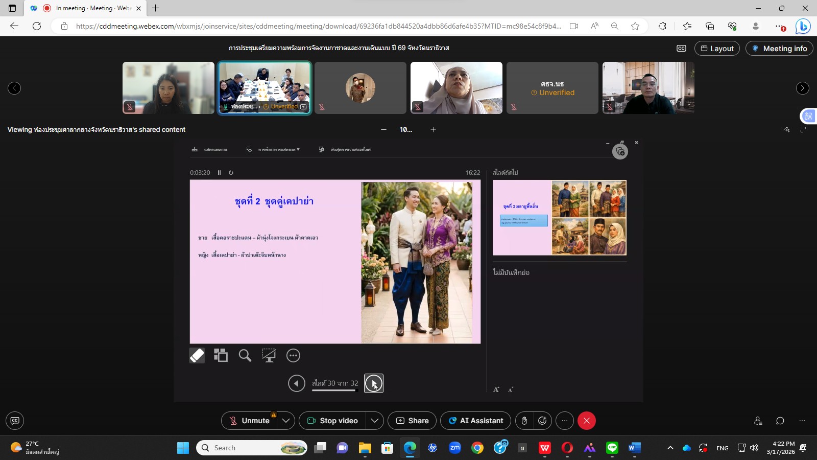 วันที่ 17 มีนาคม 2569 เวลา 14.30 - 16.00 น. นายวิเชียร ทองด้วง อุตสาหกรรมจังหวัดนราธิวาส มอบหมายนางสาวอุษา แก้วละเอียด หัวหน้ากลุ่มนโยบายและแผนงาน ร่วมประชุมคณะทำงานฝ่ายจัดแสดงเดินแฟชั่นโชว์ผ้าลายพระราชทาน ผ่านระบบอิเล็กทรอนิกส์ ณ สำนักงานอุตสาหกรรมจังหวัดนราธิวาส โดยมี นายชาคริต สุรณัฐกุล ผู้ว่าราชการจังหวัดนราธิวาสเป็นประธาน