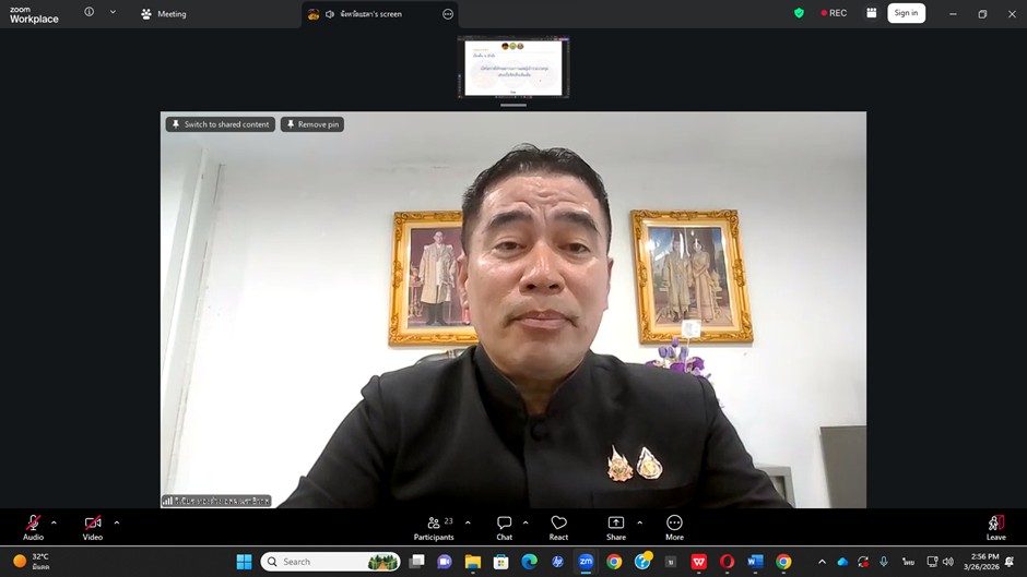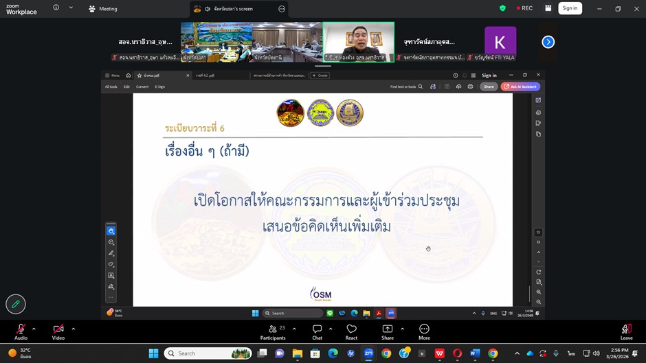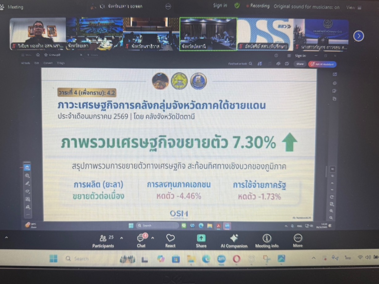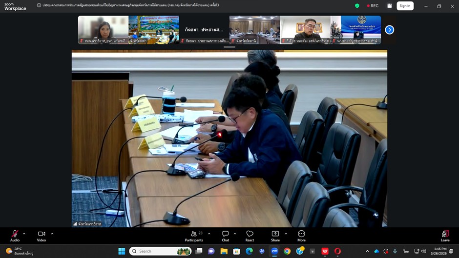 วันที่ 26 มีนาคม 2569 เวลา 13.30 น. นายวิเชียร ทองด้วง อุตสาหกรรมจังหวัดนราธิวาส พร้อมด้วยนางสาวอุษา แก้วละเอียด หัวหน้ากลุ่มนโยบายและแผนงาน เข้าร่วมประชุมคณะกรรมการร่วมภาครัฐและเอกชนเพื่อแก้ไขปัญหาทางเศรษฐกิจกลุ่มจังหวัดภาคใต้ชายแดน (กรอ.กลุ่มจังหวัดภาคใต้ชายแดน) ครั้งที่ 3/2569 ผ่านระบบอิเล็กทรอนิกส์ (Zoom Meeting) โดยมี นายอำนาจ ชูทอง รองผู้ว่าราชการจังหวัดยะลา เป็นประธานการประชุม